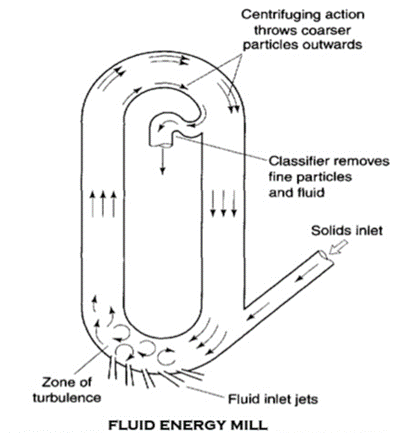 A fluid energy mill is a type of size reduction equipment that utilizes a high-velocity jet of compressed gas to impact particles, causing them to break. The principle involves energy transfer from the gas to the particles, leading to the reduction of particle size.