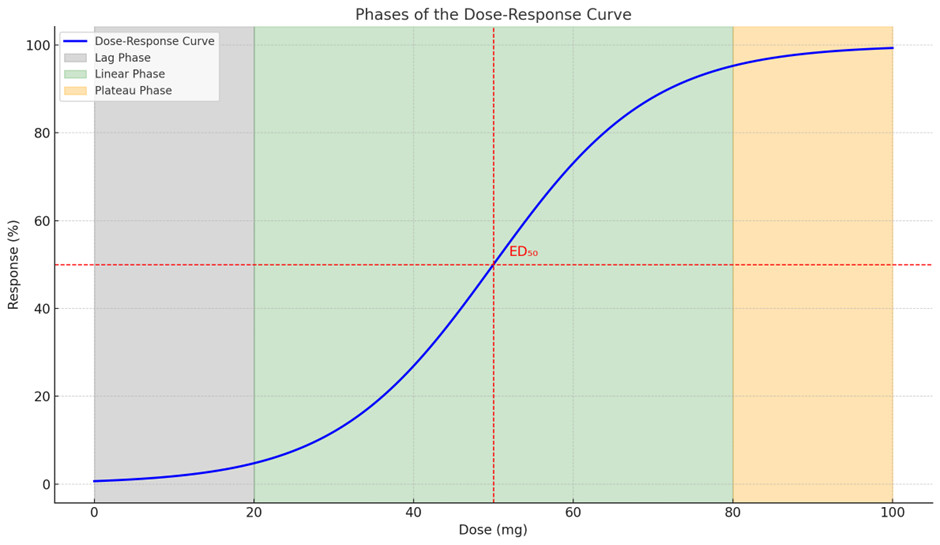3. Plateau Phase (Maximal Response): Eventually, increasing the dose further does not increase the effect. The response has reached its maximum level. Giving more of the drug may only increase side effects or toxicity.