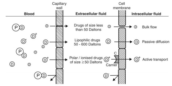 The molecular weight, degree of ionization, polarity, and lipophilicity of a drug greatly influence its permeability. Lipid-soluble and non-ionized drugs at physiological pH passively diffuse through lipid bilayers and gain access to intracellular compartments. In contrast, ionized and polar drugs are generally restricted to extracellular fluids unless specific transporter proteins facilitate their entry into cells.