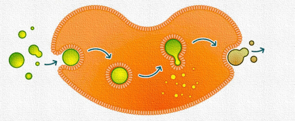 Exocytosis (in Pharmacology): A process by which cells expel drug molecules, waste, or neurotransmitters by packaging them into vesicles that fuse with the cell membrane, releasing their contents outside the cell.